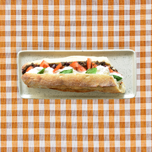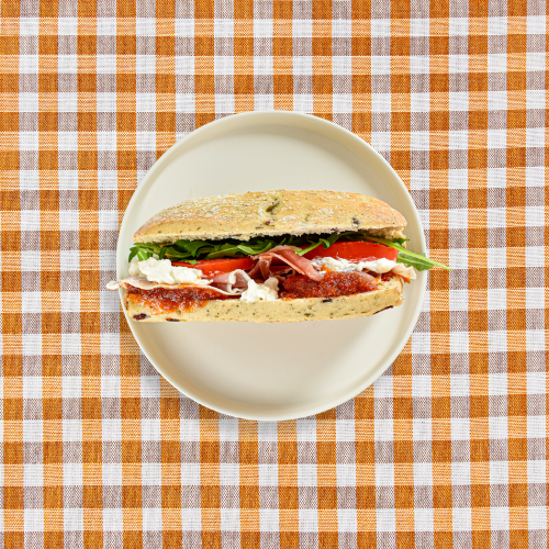 In Italian olive bread, discover our ciabatta. Immerse yourself in authentic Mediterranean flavors with our homemade tomato pesto, married to the delicious fresh taste of cured ham. Let yourself be seduced by the creamy texture of stracciatella, enhanced by the freshness of arugula.
