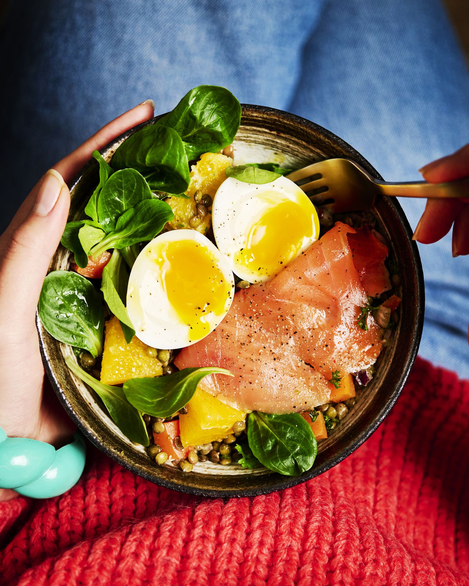 On the program: bowl with green lentils, trout and poached egg. Our new bowls and salads are all about protein (mostly plant-based) to give you a boost at lunchtime. Ready for a spring boost?